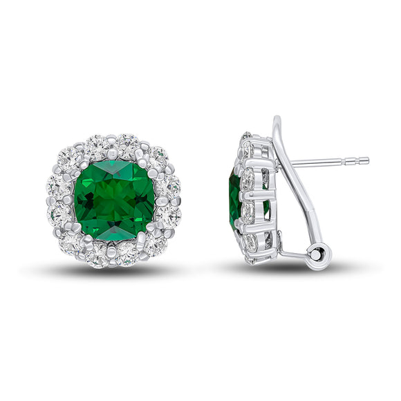 The Maureen earring features a 9x9mm emerald cushion-shaped centre cubic zirconia stone with round white surrounding stones. These earrings are set on rhodium-plated sterling silver with a post and omega fitting.