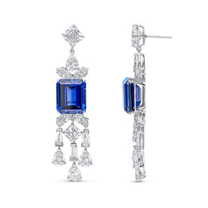 The Maxine chandelier earrings feature an 12x14mm emerald-cut sapphire cubic zirconia centre stone with a white asscher top and multi-cut stone three-strand drops. This earring is set in rhodium-plated sterling silver with a post and butterfly fitting.