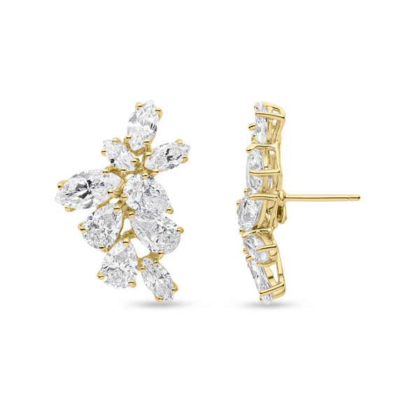 The Mayfair earrings feature a curved cluster design of all-white marquise and pear cubic zirconia stones set in gold-plated sterling silver. These earrings have a centre post and butterfly fitting.