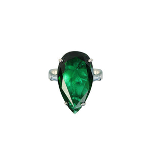 The Nicola ring features a 25x15mm emerald pear shaped cubic zirconia stone with white baguette side stones. This ring is set in rhodium-plated sterling silver.