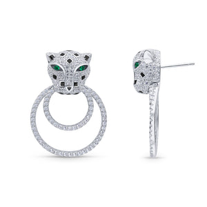 The Panther drop earrings feature all-white pavé cubic zirconia and black enamel panther heads with emerald green eyes and two static open pavé circle drops. These earrings are set on rhodium-plated sterling silver with a post and butterfly fitting.