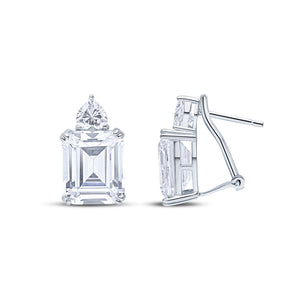 The Polly earrings feature white 12x10mm emerald-cut cubic zirconia centre stones with static white heart-shaped stone top. These earrings are set on rhodium plated sterling silver with a post and omega fitting.