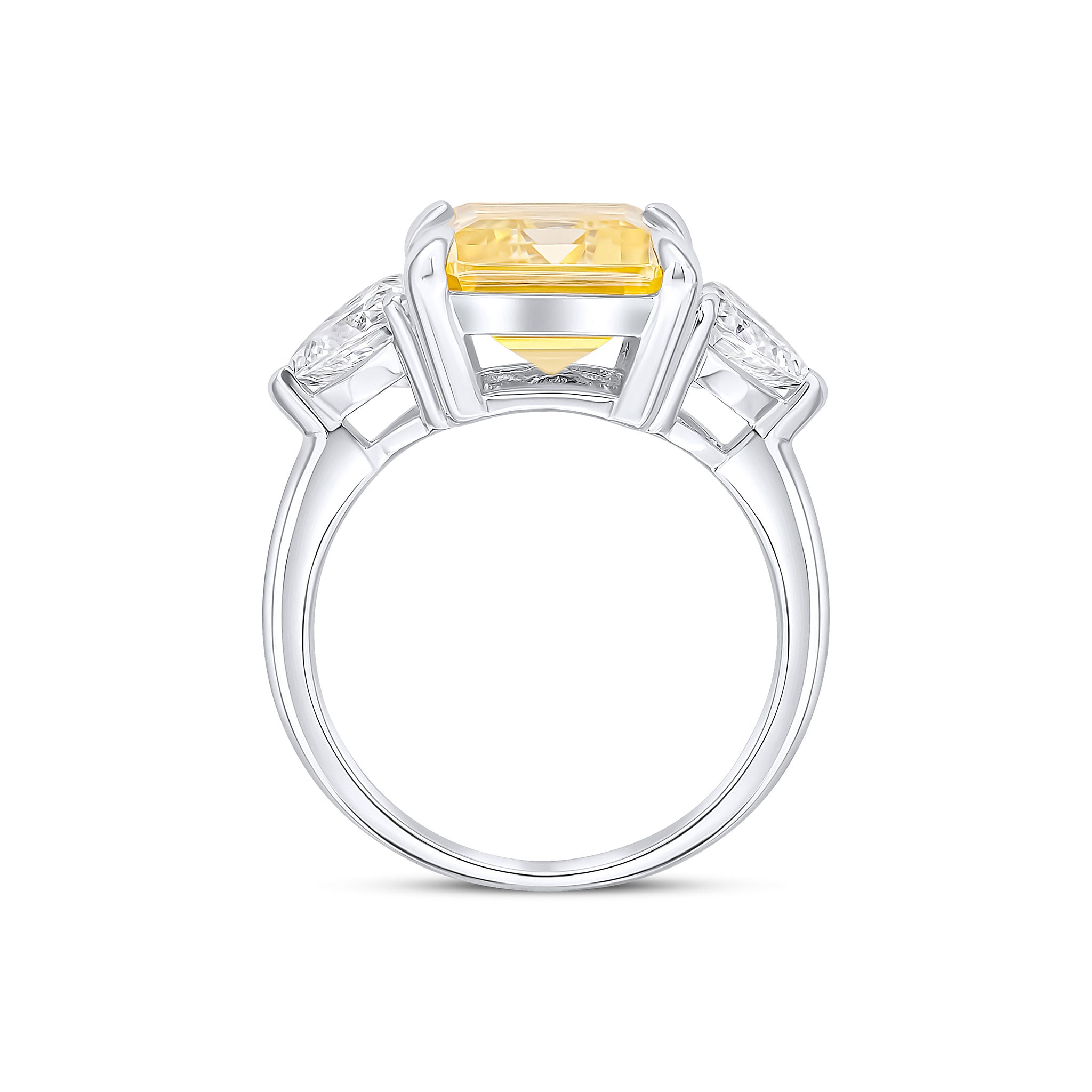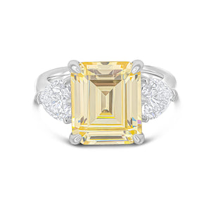 The Polly ring features a canary 12x10mm emerald-cut cubic zirconia centre stone with white heart-shaped sides. This ring is set in rhodium plated sterling silver.