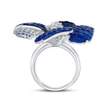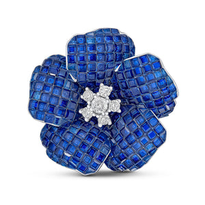 The Rhoda flower ring features overlapping petals of invisibly-set square sapphire cubic zirconia stones with a round white cluster stone centre. This ring is set in rhodium-plated sterling silver with a polished band.