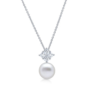 The Samara pearl pendant features an all white round and square cubic zirconia cluster top with a static 10-10.5mm white freshwater button pearl drop. This pendant is set in rhodium-plated sterling silver with chain included.