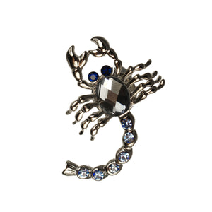 The Scorpion pin features blue crystals set in rhodium-plated base metal.