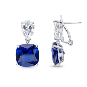 The Tabitha earrings feature a 14x14mm sapphire cushion cubic zirconia drop with a white 12x8mm pear top stone. These earrings are set on rhodium-plated sterling silver with a post and omega fitting.