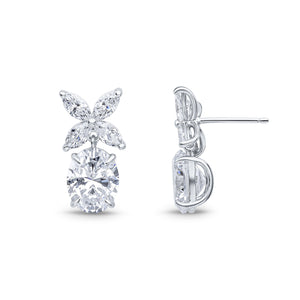 The Virginia earrings feature an all-white 10x8mm oval cubic zirconia drop with a flower marquise top, all set in rhodium-plated sterling silver. These earrings have a post and butterfly fitting and measure approximately 2cm in length.