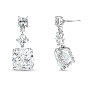 The Winslet earring features a 15x15mm cushion drop and two smaller princess-cut stones on the stem. These earrings are set in rhodium plated sterling silver with a post and butterfly fitting.